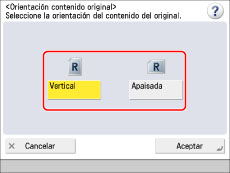 Puede especificar la orientación de un original colocado en el cristal de copia o en el alimentador como vertical u horizontal.