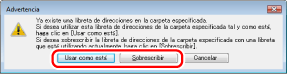 Si ya existe una libreta de direcciones en la carpeta que ha seleccionado en el paso 3, se mostrará el cuadro de mensaje siguiente. Si desea usar la libreta de direcciones existente, haga clic en [Usar como está]; si desea usar la libreta de direcciones del controlador de fax, haga clic en [Sobrescribir].