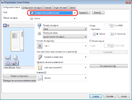Si no puede seleccionar un perfil, muestre el cuadro de diálogo de propiedades de la impresora en [Panel de control], haga clic en la ficha [Perfil] y, a continuación, compruebe si se encuentran seleccionadas las opciones [Permitir la selección de perfiles] y [Permitir la edición de la configuración]. Para conocer las instrucciones acerca de cómo mostrar el cuadro de diálogo de propiedades de impresora, consulte " Configuración de las opciones de impresora".
