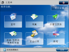 如果[部门识别码管理]设置为“打开”并且为默认屏幕设置了“限制功能”限制的功能,则启动时出现“主菜单”屏幕。(如果[部门识别码管理]设置为“打开”,则[复印]受到“限制功能”限制。)要显示为默认启动屏幕设置的功能,请在“主菜单”屏幕上选择该功能→在“登录”屏幕上输入“部门识别码”/PIN。