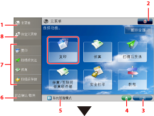 显示“主菜单”屏幕。如果使用某项功能时未显示“主菜单”屏幕,则必须在操作本机前按[主菜单]。如果要显示所有功能,按[显示全部]。