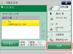 将原稿放置在输稿器中→按“主菜单”屏幕上的[扫描后发送]。