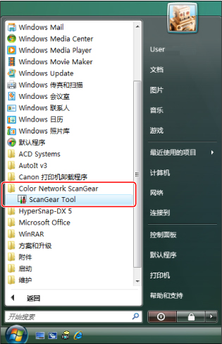 对于Windows XP,单击[开始]→[所有程序]→[Color Network ScanGear]→[ScanGear Tool]。对于Windows Vista/7,单击[