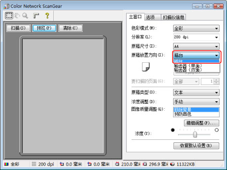 从[原稿放置方向]选择[输送器],以便从输送器扫描原稿。