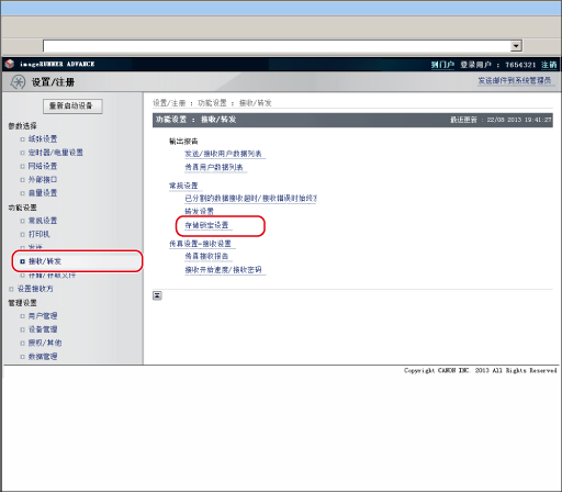 (设置/注册)→[功能设置]→[接收/转发]→[常规设置]→[设置传真/互联网传真收件箱]→[使用“传真存储锁定”]。