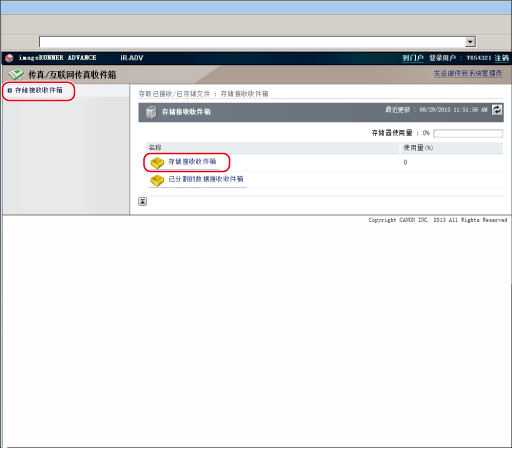 单击[传真/互联网传真收件箱]→[存储接收收件箱]→[存储接收收件箱]。