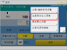 如果在“自定义菜单”中注册常用功能设置(如“复印”、“扫描后发送”和“扫描后存储”),可以在其他机器上使用注册的设置。