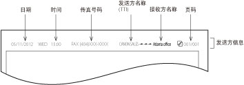 要在接收方纸张上打印接收方名称,将[发送端识别码]中的<显示接收方单位名称>设置为“打开”。(See "打印发送端识别码.")