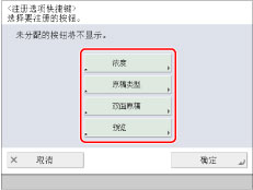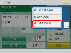 “基本传真功能屏幕”上显示四个选项快捷键。默认显示[浓度]、[原稿类型]、[双面原稿]和[预览]。这些快捷键可以更改为常用的功能。