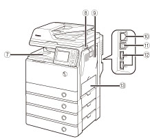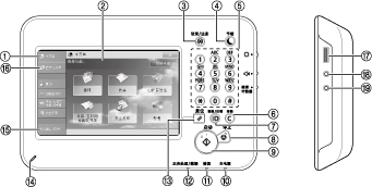 操作面板包括操作本机所需的按键、触摸面板显示屏幕和指示灯。(See "操作面板部件及其功能.")