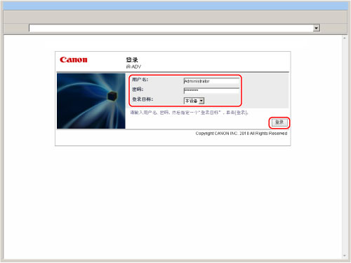 如果作为Local Device Authentication的管理员登录,且用户名和密码仍是默认设置时,单击[登录](登录)时会显示更改密码的屏幕。更改密码以增加安全性。
