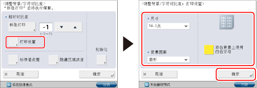 如果增加[标准值设置]的值,背景颜色加深;如果减少该值,背景颜色变浅。选择了[彩色背景上使用白色字母]时,如果增加标准值,背景颜色加深;如果减少该值,背景颜色变浅。