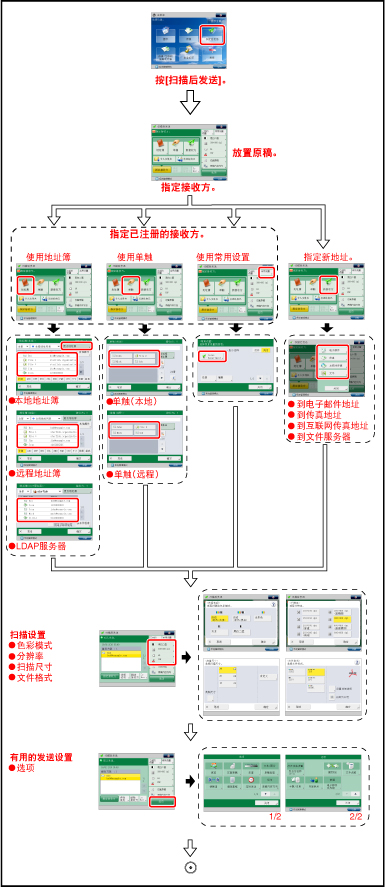 按下可以选择和使用可用于扫描和发送的其他模式。可以设置有用的发送功能,如指定原稿的方向或发送双面原稿。