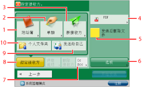 按下可以使用“地址簿”(“本地地址簿”、“远程地址簿”或“LDAP服务器”)检索和选择接收方。