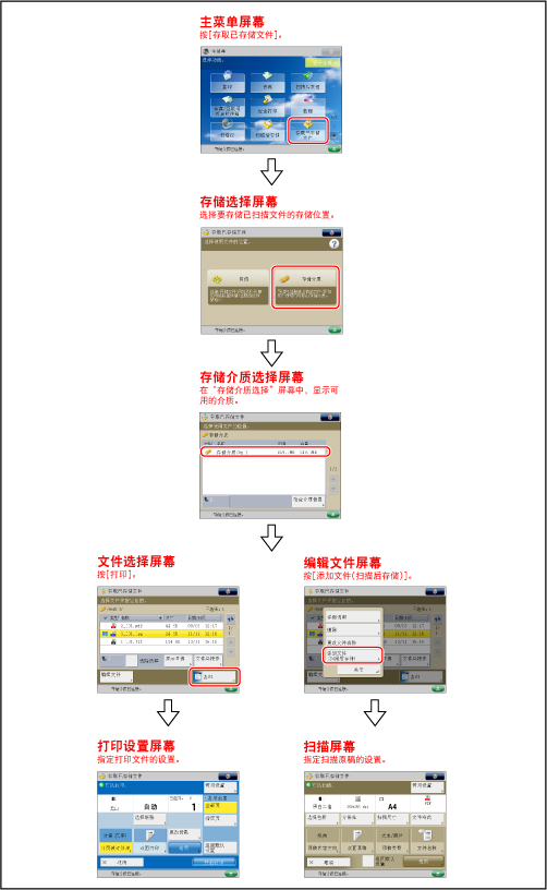 有关[添加文件(扫描后存储)]的步骤和在“扫描”屏幕上的操作说明,请参阅"添加文件(扫描后存储)"和"扫描后存储操作的流程."