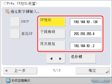 通过将[自动IP]设置为“打开”,可以让本机自动搜索正在使用的网络(LAN),获取可用的IP地址并将其中一个分配给本机。该功能可忽略DHCP服务器而自动分配IP地址,但是使用该功能时本机无法通过路由器进行通信。