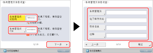 “系统管理员识别码”和“系统管理员PIN”的默认设置为“7654321”。在安装本机后首次登录时,“系统管理员识别码”和“系统管理员PIN”均输入“7654321”。