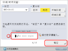 如果设置了“夏令时”,请在[开始日期]和[结束日期]中指定开始日期和结束日期。本机会自动在指定的日期和时间将标准时间提前一个小时。