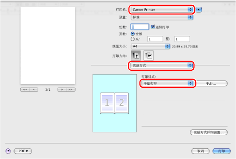 选择打印机→[完成方式]→从[打印样式]选择[手册打印]。