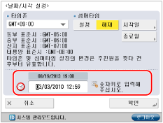 또한 설정/등록 화면에서 날짜 및 시간을 네트워크에 있는 서버와 자동으로 동기화하도록 지정할 수 있습니다. (See "TCP/IPv4 및 TCP/IPv6의 공통 설정.")