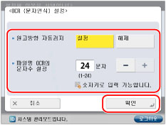 <원고방향 자동검지>에서 [설정]을 누르고 → 파일 이름으로 문자 수를 설정하려면 <파일명 OCR의 문자수 설정>의 [-] 또는 [+]를 누르고 → [확인]을 누릅니다.