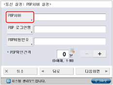 <POP확인간격>에서 POP 서버를 자동으로 확인할 시간 간격을 지정하고 → [다음화면]을 누릅니다.