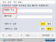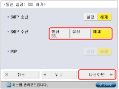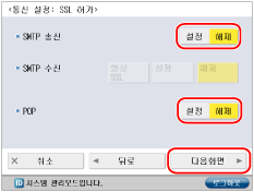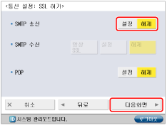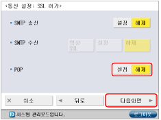 <POP수신 사용>에 대해 [설정]을 누르고 → <SMTP수신 사용>에 대해 [해제]를 누른 다음 → [다음화면]을 누릅니다.