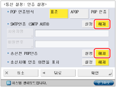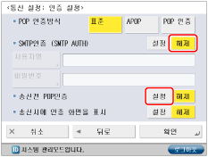 <SMTP인증 (SMTP AUTH)>의 [해제]를 누르고 → <송신전 POP인증>의 [설정]을 누릅니다.