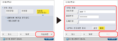 Windows Server 2003과 Active Directory 또는 Windows Server 2008과 Server Active Directory에서 LDAP 서버가 실행되는 경우에만 <인증 정보> 옆에 있는 [사용함 (보안인증)]을 선택할 수 있습니다.