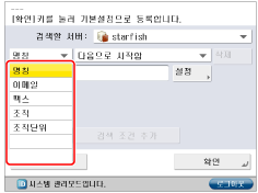 LDAP 서버에서 수신인을 검색하는 데 사용되는 자주 사용하는 검색 조건을 등록하는 경우 등록한 검색 조건이 기본적으로 검색 화면에 표시됩니다.