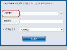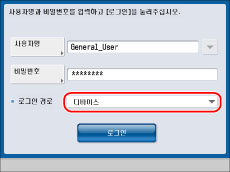 SSO-H의 Server Authentication 사용자 인증 시스템('Server Authentication + Local Device Authentication' 사용자 인증 시스템을 사용하여 Server Authentication을 수행하는 경우 포함)을 사용하는 경우 드롭다운 리스트에서 로그인할 곳을 선택하십시오. 로그인할 곳 선택에 대한 자세한 내용은 "SSO-H(Single Sign-On H)."를 참고하십시오.