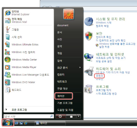 ](시작)을 클릭하고 → [제어판] → [프린터]를 선택합니다. Windows 7의 경우 [