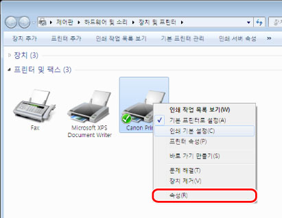 [프린터] 폴더(또는 [프린터 및 팩스] 폴더)에서 프린터 설정을 지정할 프린터의 아이콘을 오른쪽 버튼으로 클릭한 다음 → [속성]을 클릭합니다.