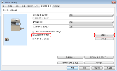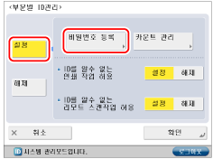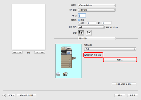 [특수 기능] 패널에서 [부서 ID 관리 사용]을 선택하고 → [설정]을 클릭합니다.