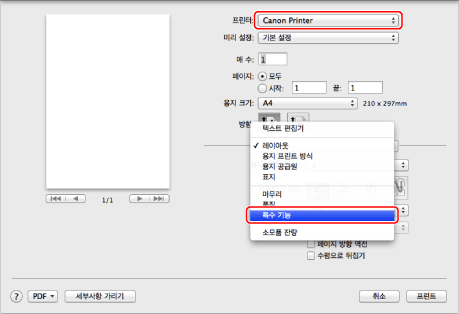 사용할 프린터를 선택하고 → [특수 기능] 패널을 선택합니다.