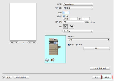 부문별 ID 관리가 설정된 프린터 드라이버를 사용하여 문서를 인쇄합니다.