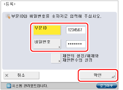 [확인]을 클릭하여 프린터에 연결해서 등록한 부문 ID 및 비밀번호가 올바른지 여부를 확인합니다.