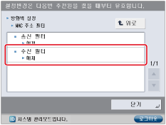 (설정/등록) → [환경 설정] → [네트워크] → [방화벽 설정] → [MAC 주소 필터]를 누릅니다.