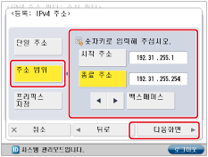 [주소 범위]를 누르고 → 조작부의 숫자 키를 사용하여 [시작 주소]를 누른 다음 '192.31.255.1'을 입력하고 → [종료 주소]를 누른 다음 '192.31.255.254'를 입력한 후 → [다음화면]을 누릅니다.