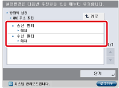 이 기기에서 권한이 있는 IP 주소를 사용하는 기기로의 전송에 대한 이력과 권한이 있는 IP 주소를 사용하는 기기로부터의 접속 이력을 확인할 수 있습니다. 이력에는 최대 100개 전송 건을 저장할 수 있습니다. 아래 절차에 따라 이력을 확인합니다.