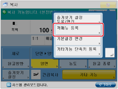 퀵 메뉴에 복사, 스캔하여 송신 및 스캔하여 저장 등 자주 사용하는 설정을 등록하면 다른 기기에서도 이러한 등록된 설정을 사용할 수 있습니다.