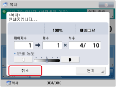 (중지)를 누릅니다. 복사 취소에 대한 자세한 내용은 "복사 작업 취소."를 참고하십시오.복사 작업을 중단하고 긴급 복사하는 방법에 대한 자세한 내용은 "긴급 복사 모드."를 참고하십시오.
