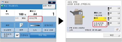 인쇄 대기 중인 예약 작업이 2개 이상인 경우, 예약된 작업에 지정된 최근 용지 크기/종류만 용지선택 화면과 일반 복사 기본 기능 화면에 나타납니다.