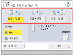 양면] 복사를 실행할 경우 화면에 표시된 지침에 따라 원고의 각 면을 스캔합니다. |