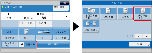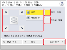 [부수인쇄 옵션]이 '해제'로 설정된 경우 [전면 인자] 및 [5곳에 인쇄]가 회색으로 처리되고 선택할 수 없습니다. (See "부수 번호 인쇄 옵션.")