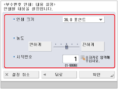 [부수인쇄 옵션]을 '설정'으로 지정하면 [10.5 포인트], [12.0 포인트] 또는 [14.0 포인트]로 부수 번호 크기를 설정할 수 있습니다. (See "부수 번호 인쇄 옵션.")