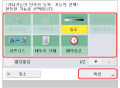네 가지 기타 기능 단축키가 팩스 기본 기능 화면에 표시됩니다. [농도], [원고 종류], [양면원고] 및 [미리보기]가 기본값으로 표시됩니다. 이러한 단축키를 자주 사용하는 기능으로 변경할 수 있습니다.