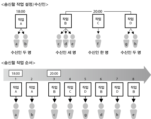 또한 예약 송신 작업 수는 예약 송신 설정이 사용되지 않은 다른 작업이 처리 중이거나 지정된 수신인에 영향을 주는 기타 요인이 있는 경우 감소될 수 있습니다.