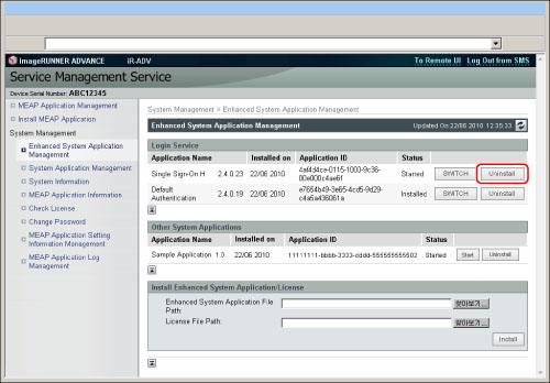 기본 인증(부문별 ID관리), 현재 사용 중인 로그인 서비스(<Stop after Restart>가 표시된 상태의 로그인 서비스) 및 다음 번에 기기를 시작할 때 사용할 로그인 서비스(<Start after Restart>가 표시된 상태의 로그인 서비스)는 제거할 수 없습니다.