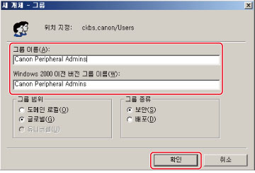 [새 개체 - 그룹] 대화 상자에서 그룹 이름을 입력하고 ('Canon Peripheral Admins') → [확인]을 누릅니다.